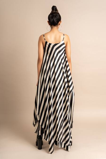 Black and white asymmetric hem top featuring striped digital print. Paired with a matching circular skirt with gathered details and tie-up.