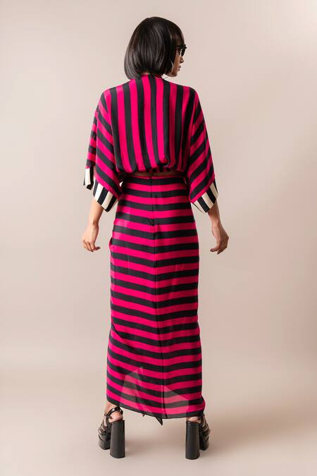 Multi Color Crepe V-neck Stripe Print Top And Draped Skirt Set