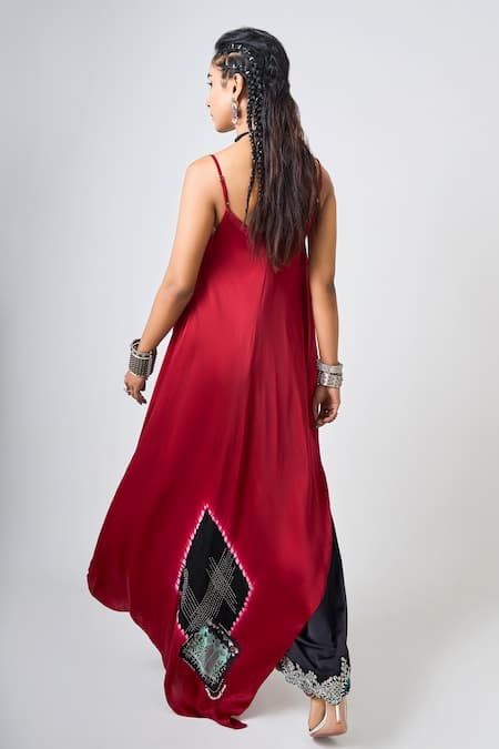 Red asymmetric tie-dye singlet top featuring kantha stitch embroidery and beaded embellishments. Paired with black pants showcasing tribal printed hems and sequin work.