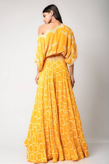 Mustard yellow crepe lehenga with hand dyed in polka dots pattern & embroidered waistband. Paired with hand dyed one shoulder top with scallop hem border in mirror & swarovski work.