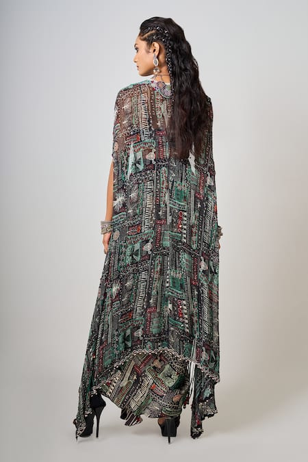 Buy_Nupur Kanoi_Black Crepe, Georgette, Satin Beads, Tribal Embellished Cape Cowl Skirt Set _at_Aza_Fashions