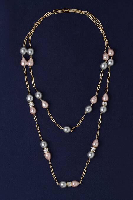 Gold plated layered chain necklaces strewn with grey oval shell pearls and pink drop shaped shell pearls with gold plated Swarovski beads.