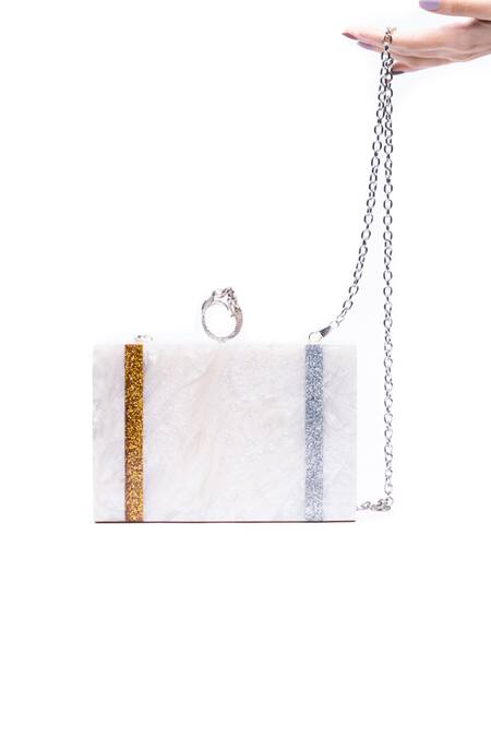 White marble textured clutch featuring metallic gold and silver embellished stripes