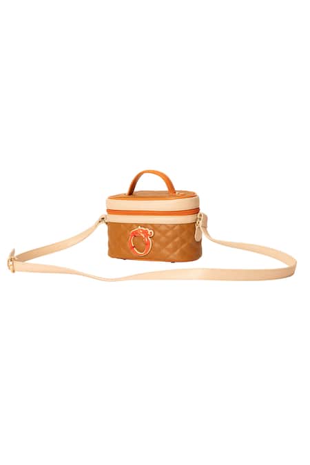 Tan vegan leather vanity bag featuring a zip closure and an adjustable sling