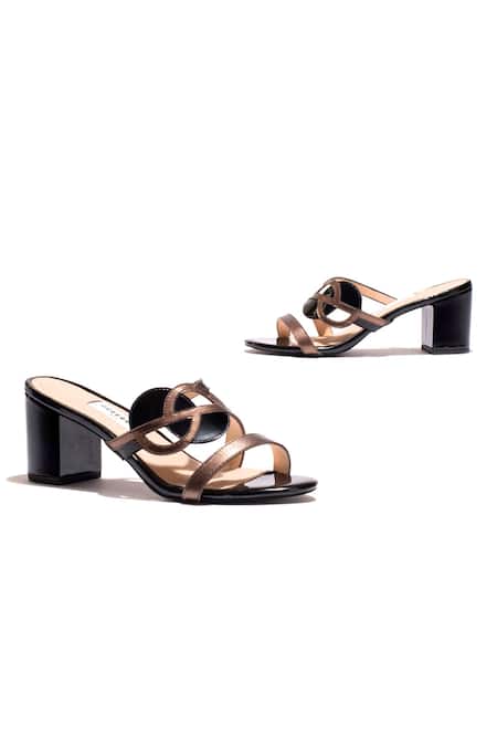 Black and brown block heels featuring circular cutwork strap