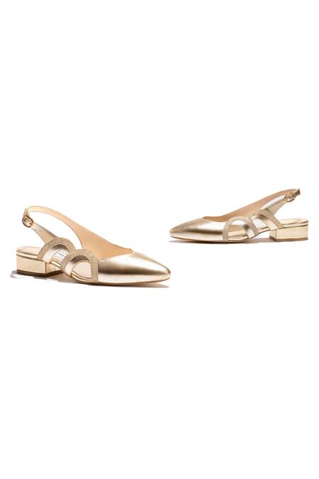 Gold metallic mules featuring a semi-circular cutwork pattern