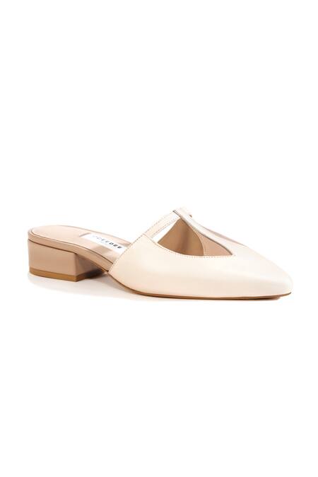 Beige mules featuring a pointed toe, block heel and cut out strap design