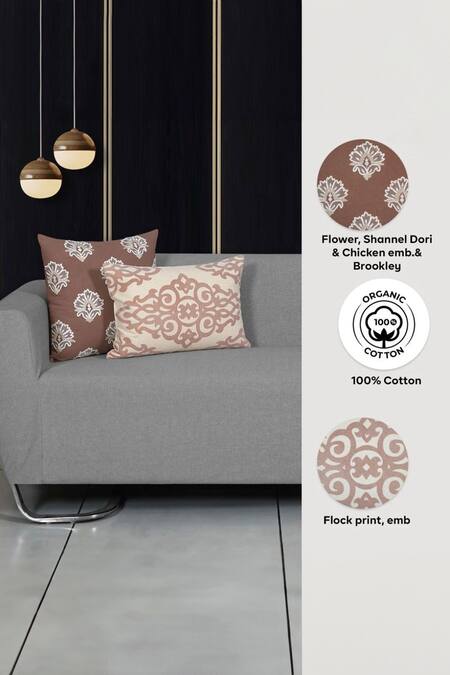 Beige cotton three pieces cushion covers crafted in square shape with all over brookley floral pattern, contrast chikankari & shaneel dori embroidery. Paired with two pieces off white rectangle shaped cushion cover with all over contrast folk print.