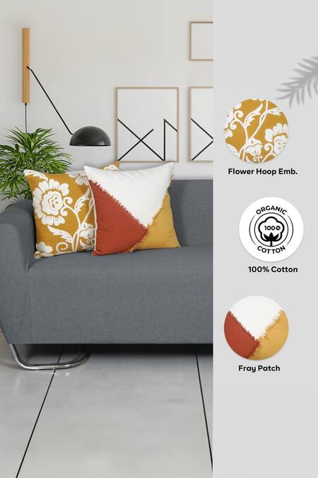 Mustard colorblock 2 pcs cushion cover with fray border embroidered cushion cover. Comes with hoop embroidered 3 pcs cushion cover in floral pattern