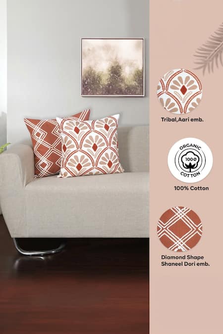 Rust set of 3 cushion covers with contrasting shaneel dori diamond shape embroidery. Comes with set of 2 off white cushion covers with contrasting aari embroidery in tribal motif pattern.