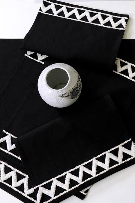 Black 100% Cotton Dori, Embroidered Runner And Mat Set