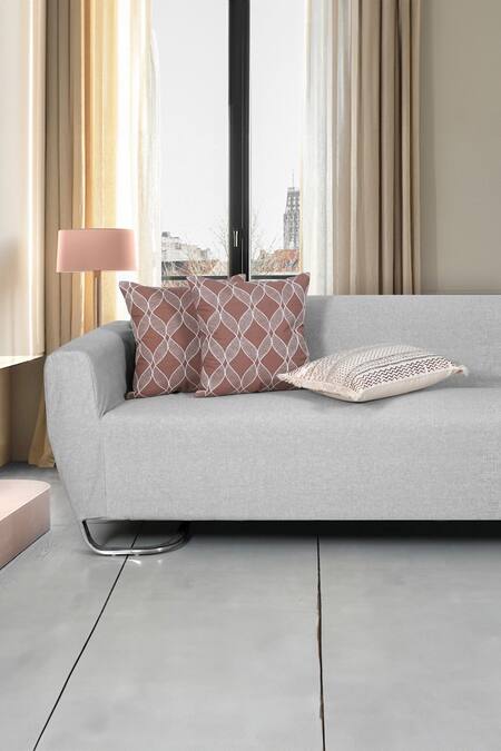 Beige cotton three pieces cushion covers crafted in square shape with all over wavy stripe pattern, contrast aari & dori embroidery. Paired with two pieces rectangle shaped cushion cover with all over tribal foil print & fringe tasselled border.