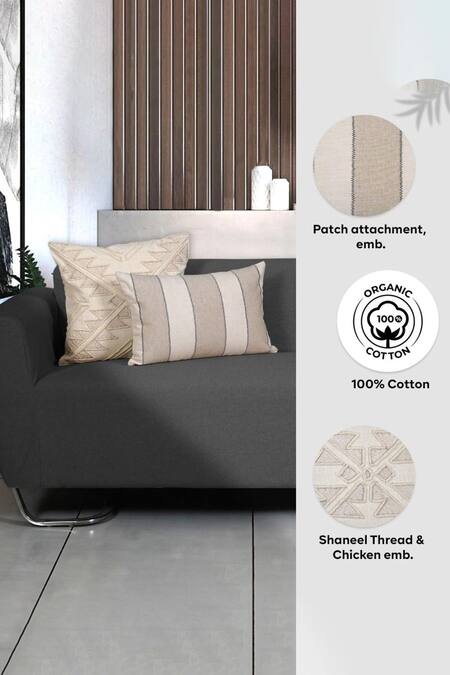 Off white set of 3 cushion covers with shaneel thread & chicken embroidery, with brookley accents. Comes with set of 2 striped patch, chicken embroidered rectangular cushion covers.