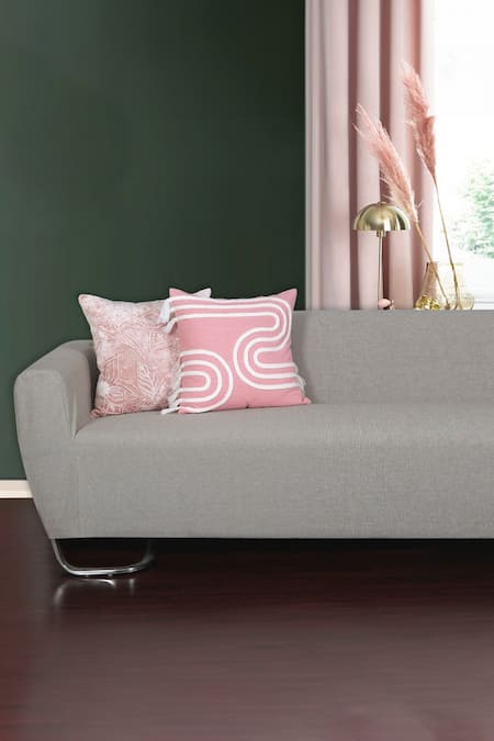 Light peach set of 3 cushion covers with floral and geometric cord embroidery.