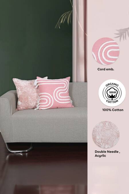 Light peach set of 5 cushion covers with floral and geometric cord embroidery.
