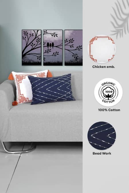 Off white and blue set of 5 cushion covers with geometric embroidery, contrast tassels and beaded work.