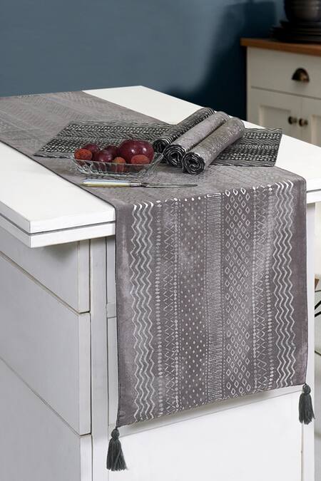 Grey cotton table runner in rectangle shape, all over tribal pattern & metallic silver foil print. Comes with six pieces printed table mats.