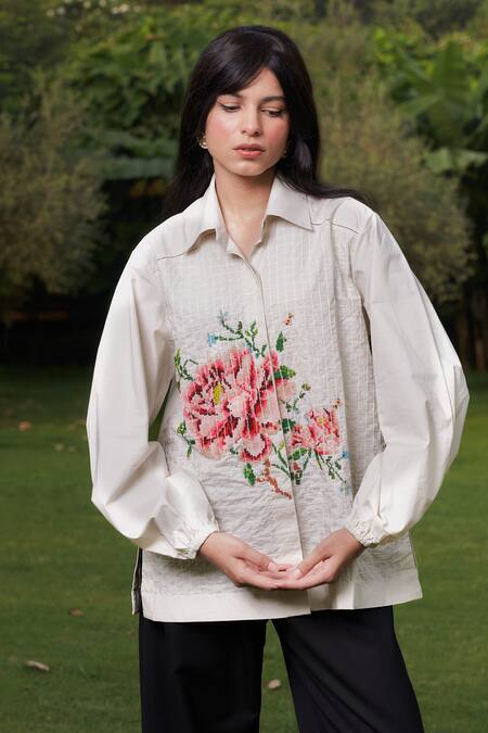 Buy_Ode To Odd_Beige 100% Cotton Poplin Hand Embroidered Bead Work Floral Shirt _at_Aza_Fashions