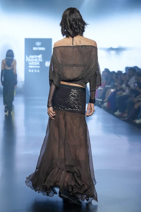 Brown off shoulder blouse in a lurex soft knit base with long sleeves. Paired with an embroidered basque skirt featuring a layered design and asymmetrical hem.