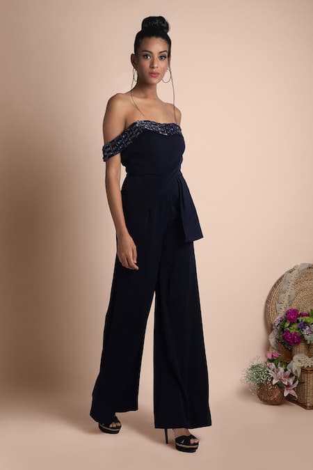 Navy blue jumpsuit highlighted with tone-on-tone embellishments on the off-shoulder neckline, draped waist and flared bottom.