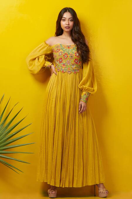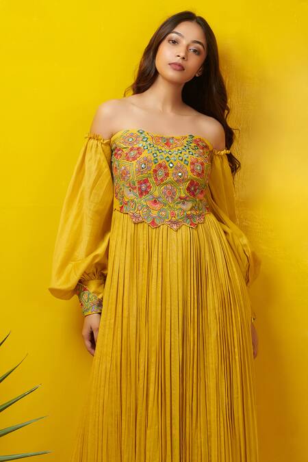 Mustard yellow maxi dress with pleated flare, bishop sleeves & placement multi-color thread work.