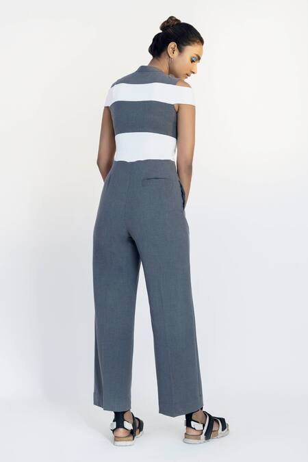 Grey Lycra Round Off Shoulder Striped Jumpsuit