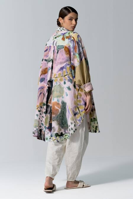 Multi Color Linen Embroidery Collared Abstract Print Tunic