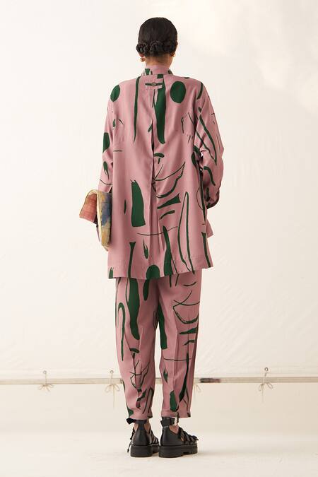 Pink shirt featuring sage green abstract prints with a collared neckline and three-quarter sleeves. Paired with matching pants that have side seam pockets.