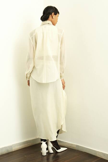 Beige shirt featuring eye motif embroidery and floral accents on the neckline and cuffs. Paired with a draped raw silk skirt for a coordinated look.