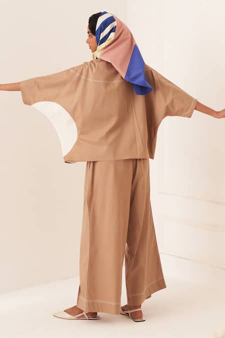 Beige shirt featuring a circular design detail and button closure. Paired with matching wide-leg pants for a coordinated look.