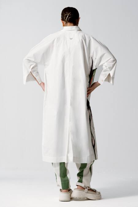 White shirt dress featuring multi color placement stroke print and patch work