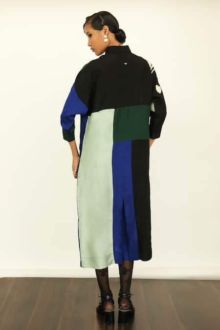 Multicolor shirt dress featuring geometric and floral patchwork with a collar neckline and three-quarter sleeves
