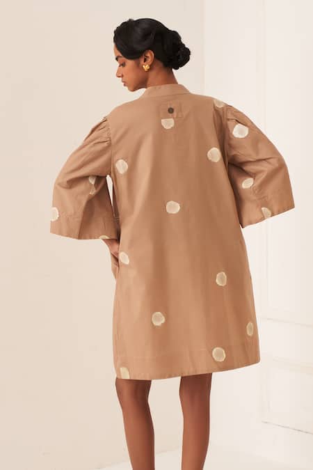 Beige dress featuring puff sleeves and circular embroidery