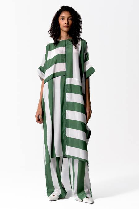 Green Cotton, Silk Boat Neck Maze Stripe Pattern Tunic
