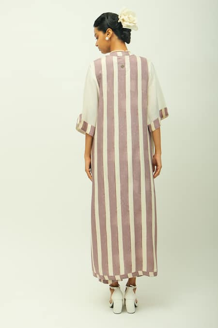 A lilac and ivory slub viscose kurta features a shirt collar, square yoke, top stitch detailing, voluminous full sleeves, gathers on sleeves and bust line, and side slits. It is paired with straight-cut trousers in coordinating lilac and ivory with vertical stripes.