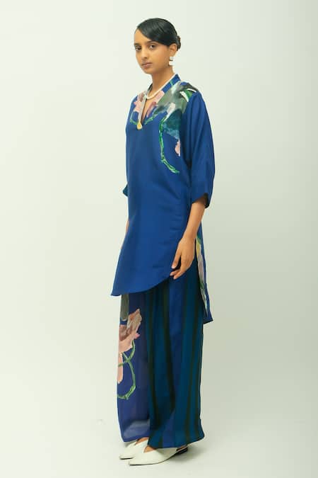 A navy blue bemberg muslin kurta features a V-neckline, three-quarter sleeves, and hand-painted abstract expressionist digitally transferred print with bead detailing. It is paired with anti-fit, flared navy blue bemberg muslin pants, which have a front belt, back elasticated waist with a drawstring, side pockets, and a matching hand-painted abstract expressionist digitally transferred print.