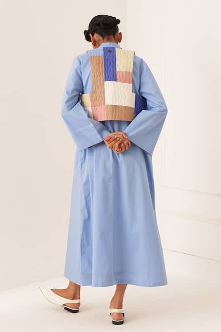 Cotton dress in a light blue hue featuring a v-neckline and side pockets. Accompanied by a multicolor quilted jacket with a unique patchwork design.