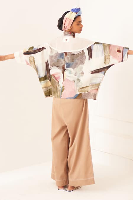 Multicolor shirt featuring a cotton woven dobby fabric with abstract prints. Paired with wide-leg cotton pants for a relaxed fit.