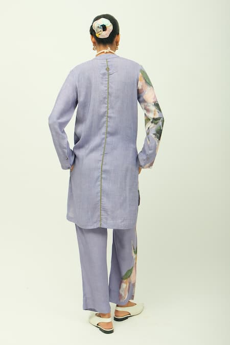 A lavender anti-fit kurta crafted from slub viscose, featuring a mandarin collar, half placket, full sleeves, and side pockets, adorned with a hand-painted abstract expressionist digitally transferred print. It is paired with anti-fit straight pants, which have a drawstring, front belt, back elasticated waist, side pockets, and a matching hand-painted abstract expressionist digitally transferred print.