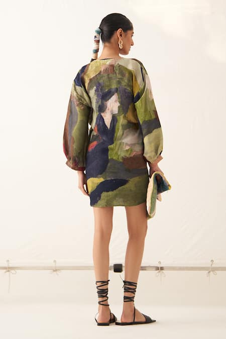 Multi color dress featuring an all-over abstract expressionist print with a gathered yoke and hand embossed vintage coin detail on the back