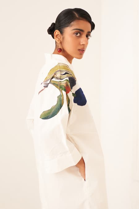 White dress featuring a V-neckline and 3/4 sleeves with colorful applique detailing