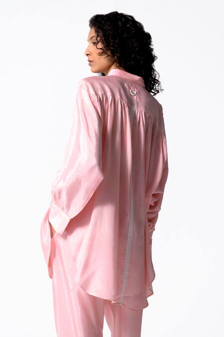 Pink shirt featuring a collar, full sleeves, and contrasting white tape detail. Paired with matching pants in a relaxed fit.