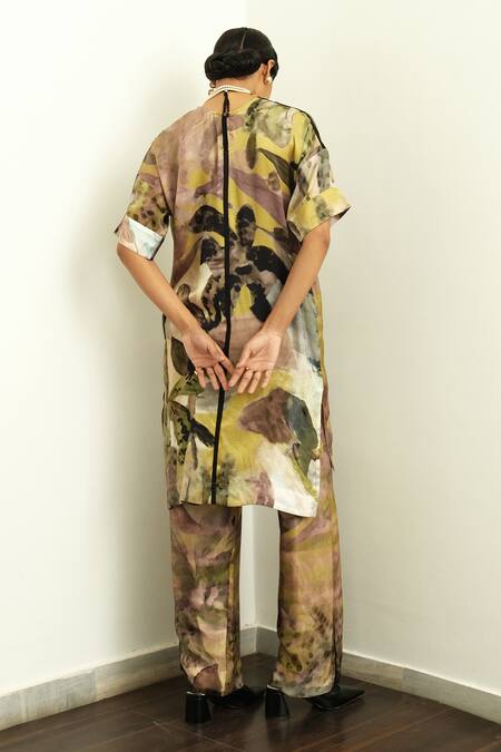 Multi color kaftan featuring a hand-painted abstract expressionist design with digital print. Paired with coordinating pants that include side pockets.
