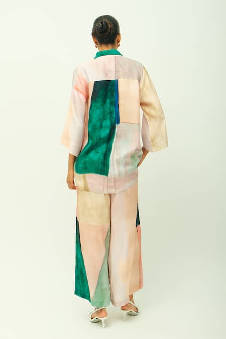 This green bemberg muslin jacket features a hand-painted abstract print with a lapel collar and three-quarter sleeves.