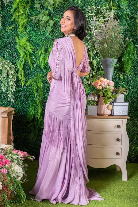 Purple pre-draped saree featuring fringe lace border and back deep V neck. Paired with a pearl embroidered blouse with scallop V neck and half sleeves.