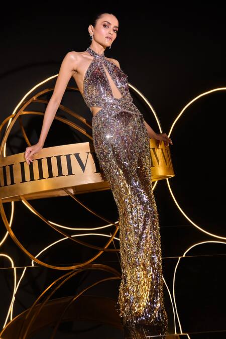 Hand embellished with crystals, sequins, pearls, and beads, Cut outs on waist for a bold look
