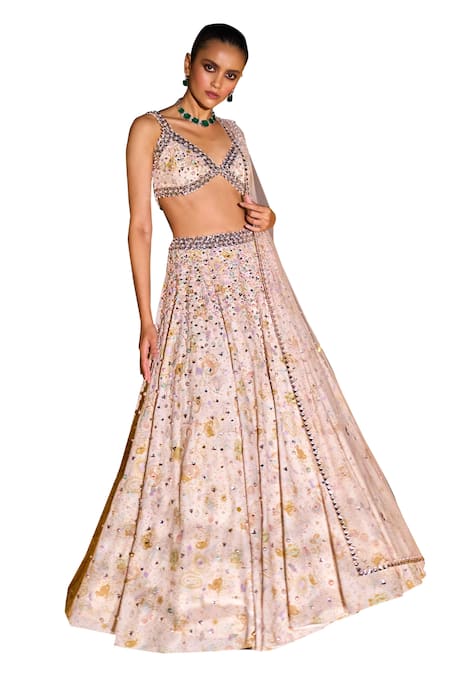 Degrading hand embroidery on lehenga, Astro cosmic print all over, Matching print on blouse