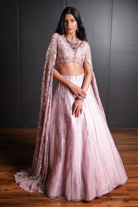 Pink lehenga featuring abstract floral lace applique embroidery with sequins, crystals, and beads. Paired with a draped blouse showcasing a V neck and draped sleeves.