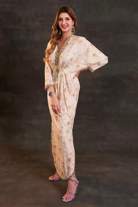 Multi color kaftan featuring hand embroidered neckline and cuffs with an all over astro cosmic print