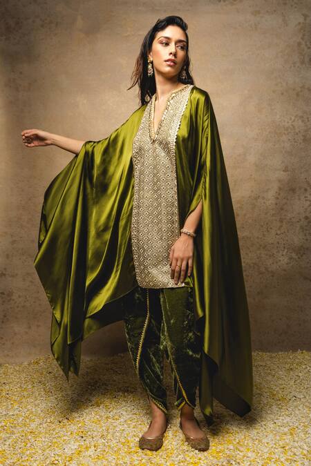 Green Velvet, Satin Beads, Embroidery V-neck Heena Kaftan Kurta And Tulip Pant Set